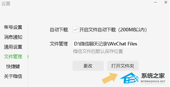 3. 点击“文件管理”选项,在弹出的界面里找到“打开文件夹”选项,而“文件管理”处显示的路径就是微信文件的保存位置,点击“打开文件夹”。