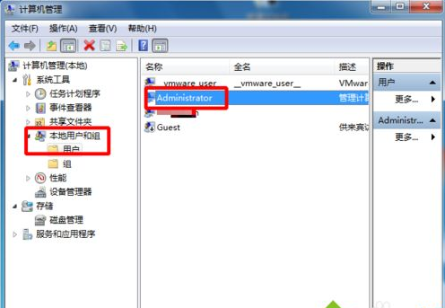 2、在打开“计算机管理”界面中,展开“本地用户和组用户”,点击"Administrator"