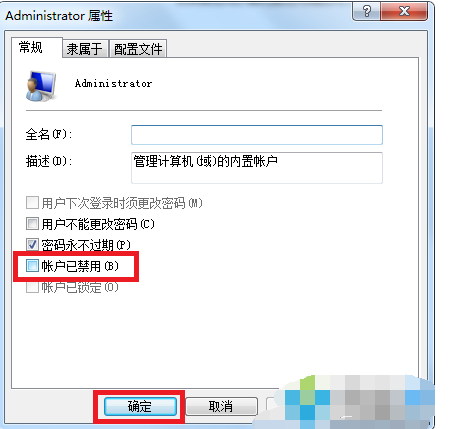 3、在打开"Administrator"窗口中,把”账号已禁用"勾选,双击确认