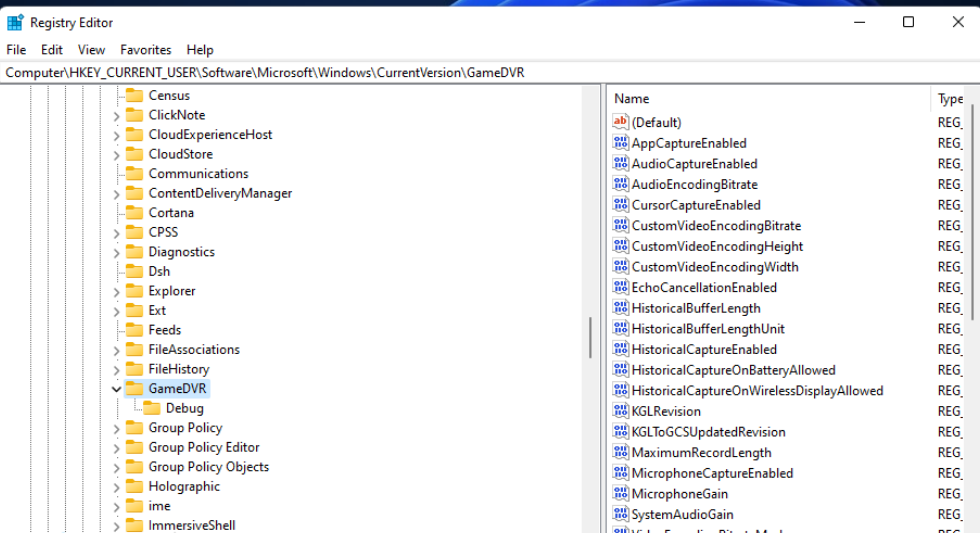 在注册表编辑器中打开此密钥路径:HKEY_CURRENT_USERSOFTWAREMicrosoftWindowsCurrentVersionGameDVR