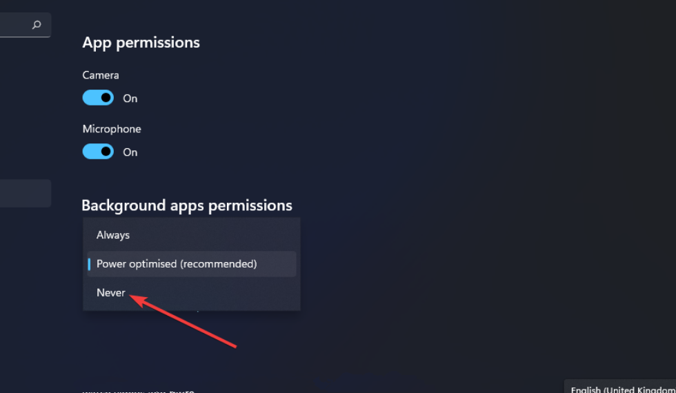 接下来,在后台应用程序权限菜单上选择从不选项。
