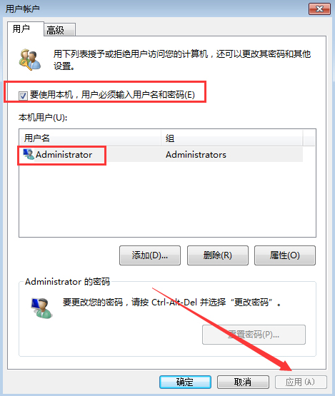 待用户账户窗口弹出后,取消勾选“要使用本计算机,用户必需输入用户名和密码”,并点击“应用”;