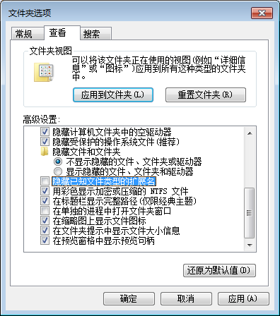 3、找到【隐藏已知文件夹类型的扩展名】,点击方框中的“√”,取消选中,点击【应用】--【确定】。