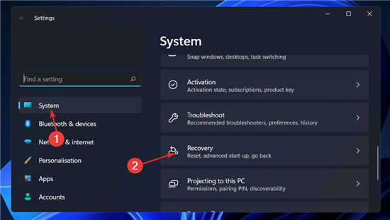 1、按Windows+I键打开设置应用程序,然后导航到左侧面板中的系统,然后从右侧导航到恢复。