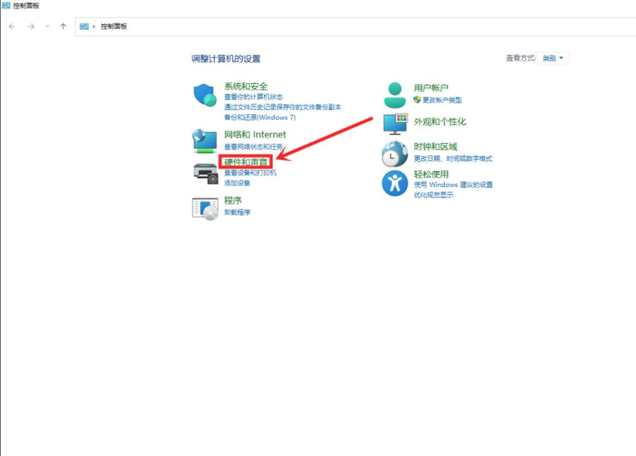2、在打开的【控制面板】中找到【硬件和声音】并点击进入