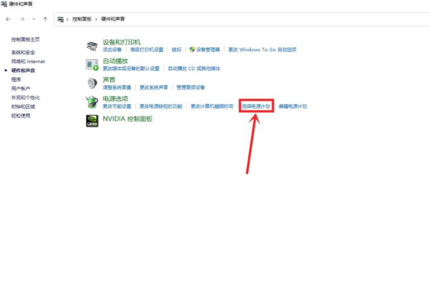 3、接着在硬件和声音界面中点击【电源选项】下方的【选择电源计划】