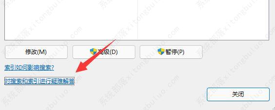 4、打开后,点击左下角的“对搜素和索引进行疑难解答”。