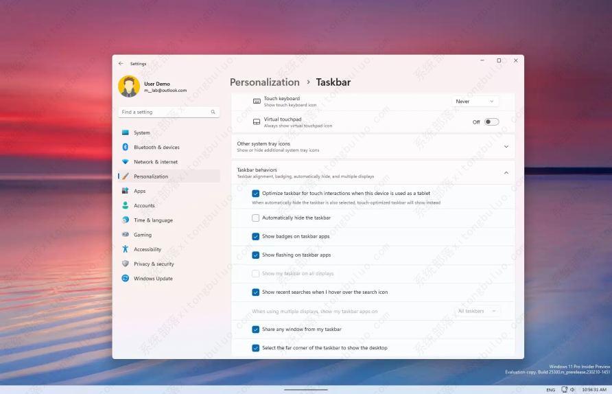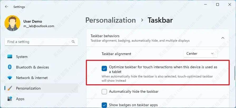 要在 Windows 11 上启用针对平板电脑优化的任务栏,请使用以下步骤: