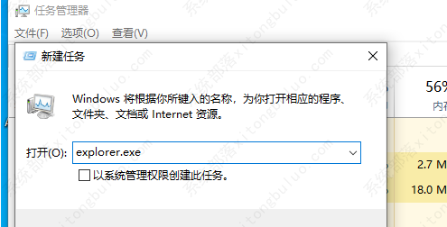 3、在新建任务栏里输入命令explorer.exe,按下回车键即可。