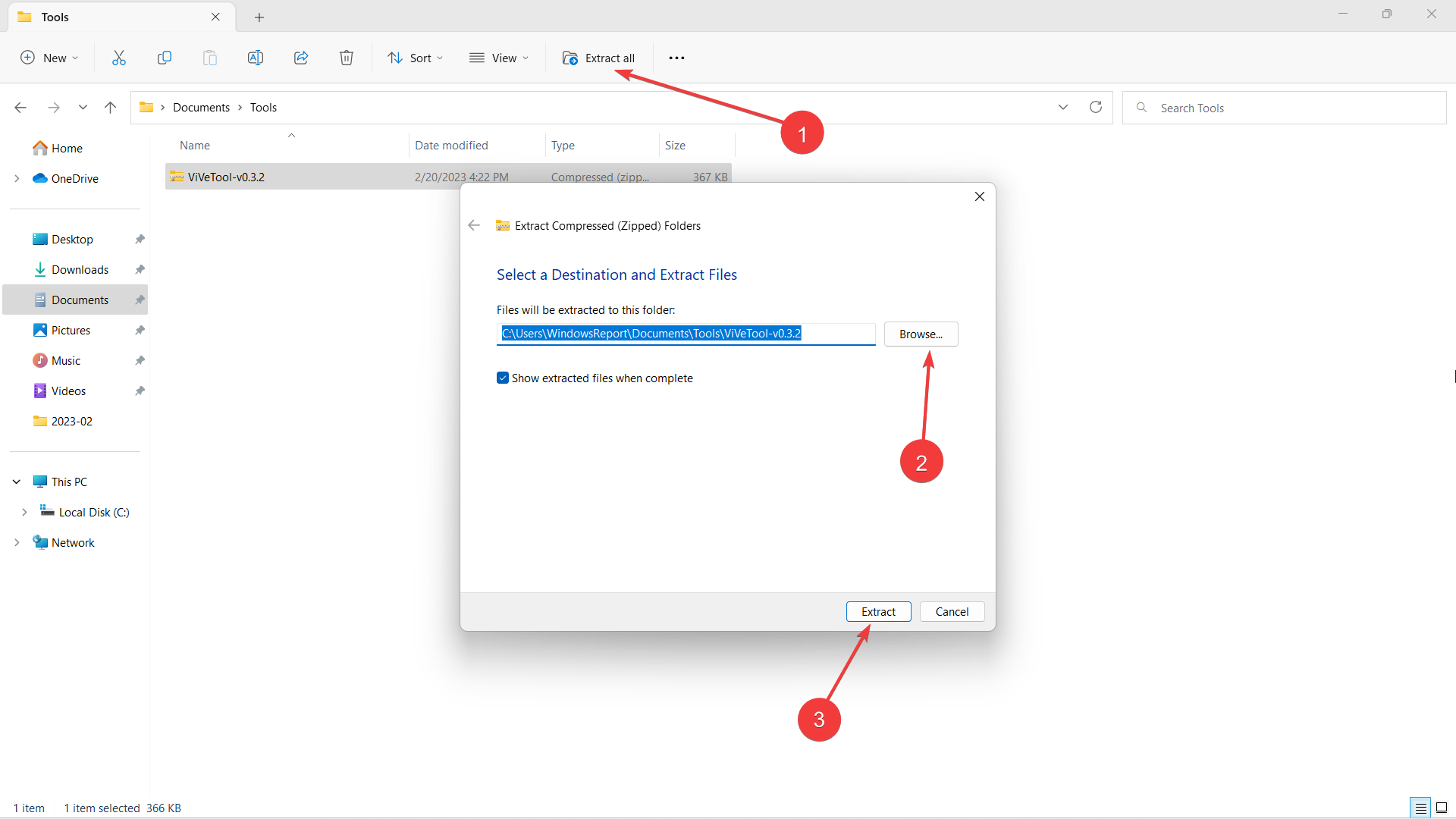 3、下载后,单击“全部提取”,单击“浏览”选择要提取的位置,然后点击“提取”。在本例中,我们在 C:\Users\WindowsReport\Documents\Tools\ViVeTool-v0.3.2 中提取它。