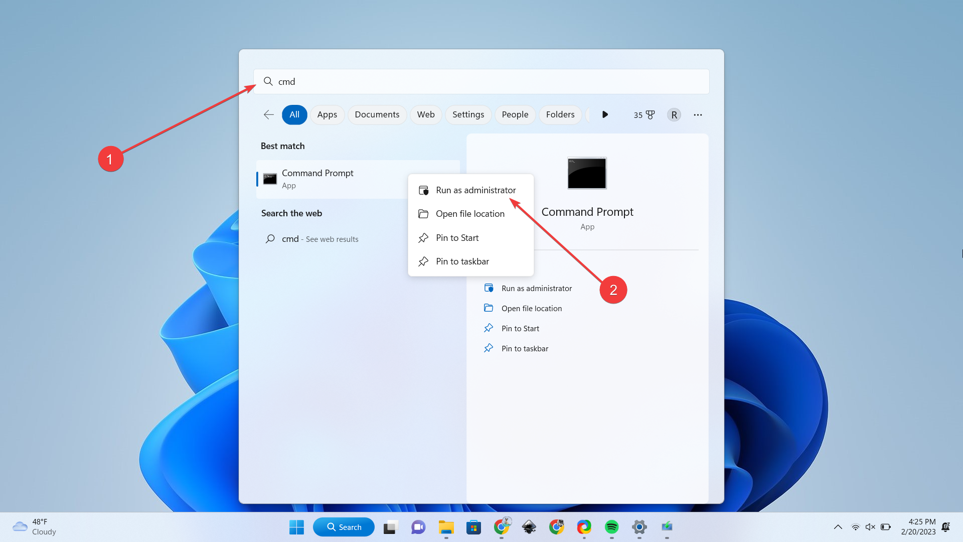 4、点击键盘,然后键入“ cmd”并右键单击命令提示符 - >以管理员身份运行。