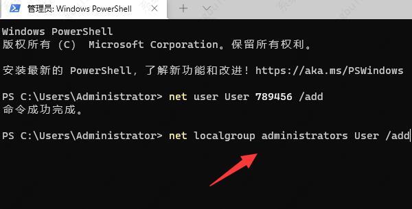 3、接着输入“net localgroup administrators User /add”,回车键运行,给用户赋予管理员权限。