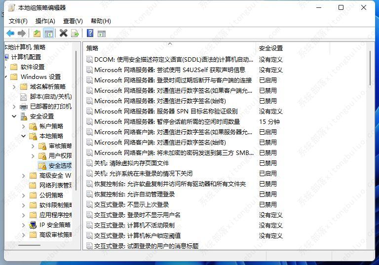 2、在新界面中,依次点击“计算机配置——Windows设置——安全设置——本地策略——安全选项”。