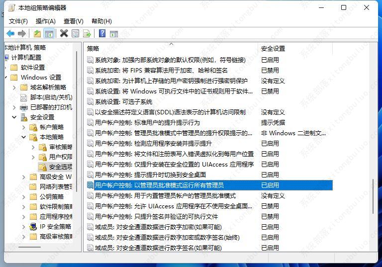 3、在该路径下找到右侧中的“用户账户控制:以管理员批准模式运行所有管理员”选项。