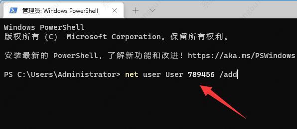 2、进入窗口后,输入命令“net user User 789456 /add”,回车键执行。(命令的意义在于创建一个用户,登录密码为789456)