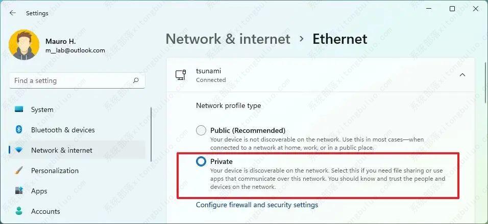 4、在“网络配置文件类型”部分下,选择私人选项以在计算机上启用打印共享。
