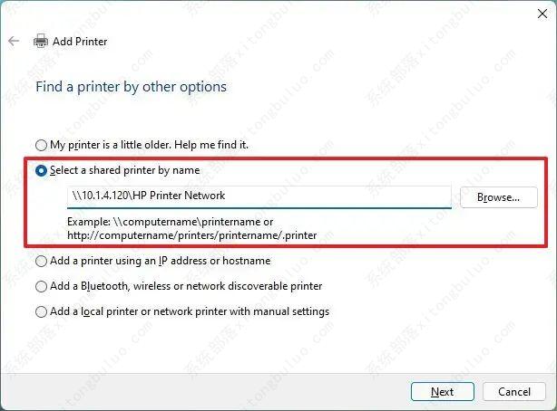 6、选中按名称选择共享打印机选项。