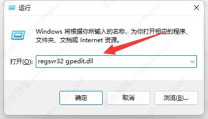 2、接着输入“regsvr32 gpedit.dll”并回车注册组策略,看看能不能解决。