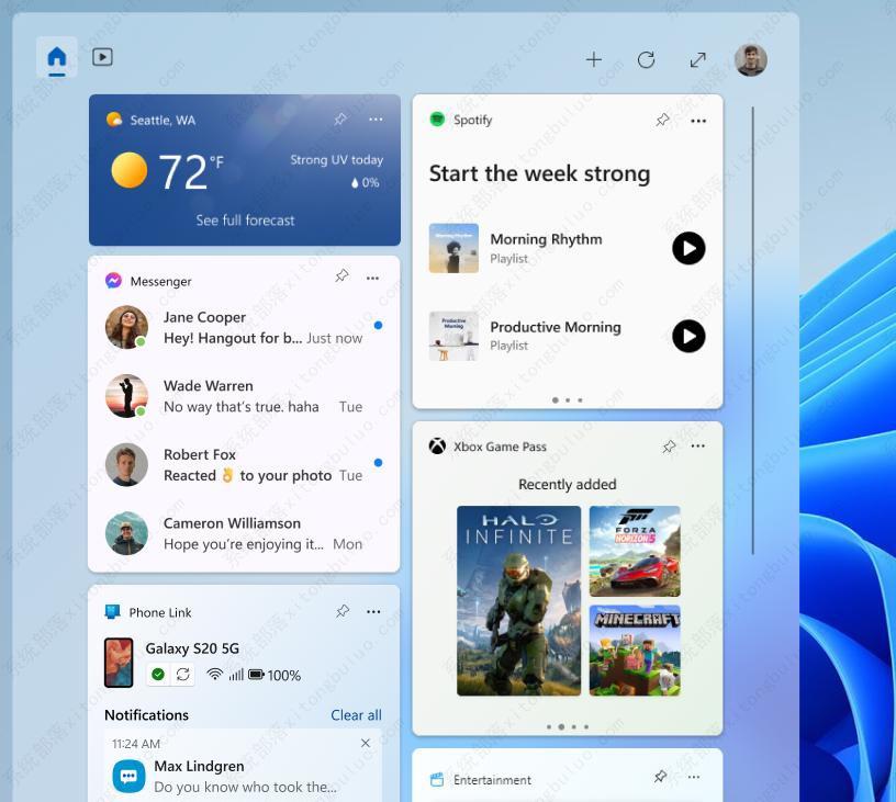 新小部件:Messenger、Spotify、Phone Link 和 Xbox Game Pass