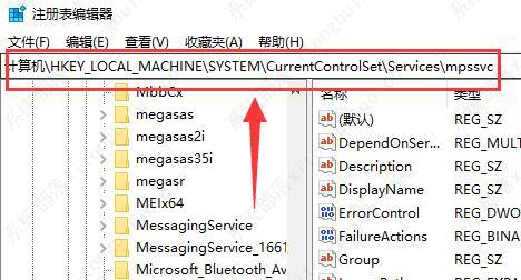 2、接着进入“计算机\HKEY_LOCAL_MACHINE\SYSTEM\CurrentControlSet\Services\mpssvc”路径。