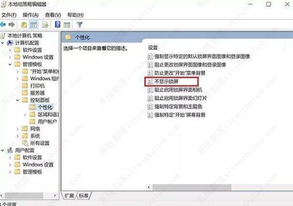 2、打开Win10组策略操作面板,在左侧依次展开 计算机配置 -》 管理模板 -》 控制面板 -》 个性化,然后在右侧双击“不显示锁屏”。
