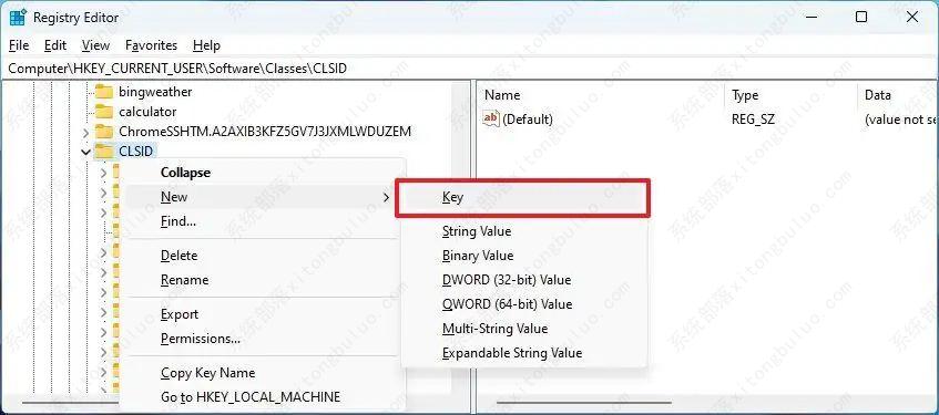 4、右键单击CLSID密钥,选择新建菜单,然后选择密钥选项。