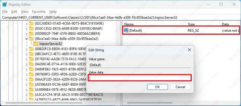 8、双击新创建的键并将其值设置为空白以启用 Windows 11 上的经典上下文菜单。