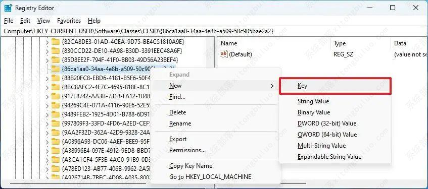 5、将密钥命名为{86ca1aa0-34aa-4e8b-a509-50c905bae2a2}并按Enter 键。