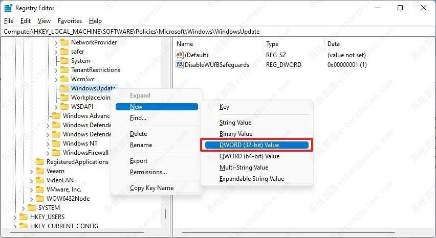 6、右键单击“WindowsUpdate”键,选择“新建”子菜单,然后选择“DWORD(32 位)值”选项。