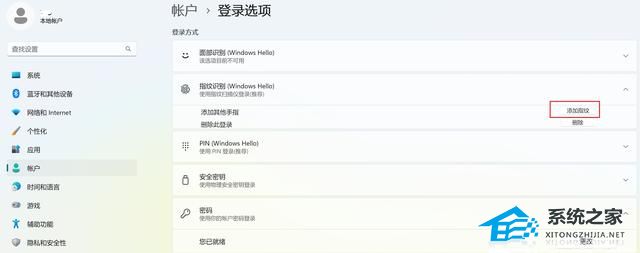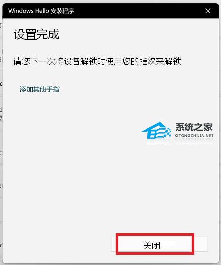 9. 指纹登入已设置完成。这里还有一个选项[添加指纹],您可以设定另一根手指的指纹识别。
