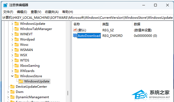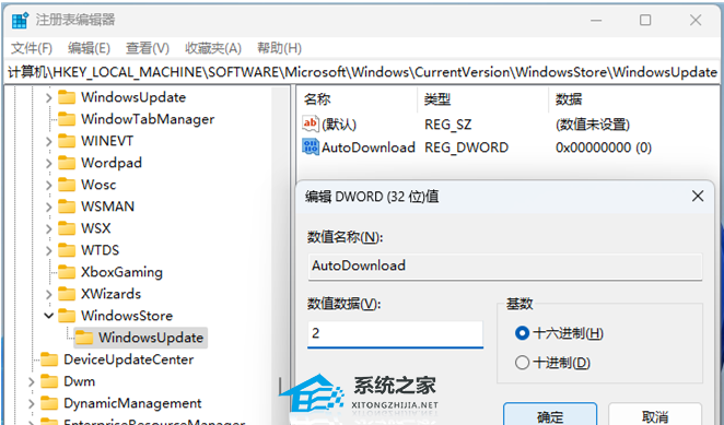 5. 双击打开(如果没有就新建一个)名为【 AutoDownload 的 DWORD(32 位)】值,将其值改为【1】启用应用自动更新,【2】禁用应用自动更新,【3】只自动下载,但不安装。