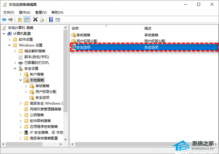 步骤2. 在本地组策略编辑器管理单元窗口中,导航到此处:计算机配置 > Windows设置 > 安全设置 > 本地策略 > 安全选项。