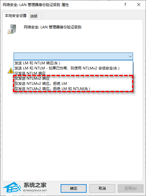 步骤4. 在属性详情窗口中单击下拉菜单中选择这三个选项,分别为“仅发送NTLMv2响应”、“仅发送NTLMv2响应。拒绝LM”和“仅发送NTLMv2响应。拒绝LM和NTLM(&)”。