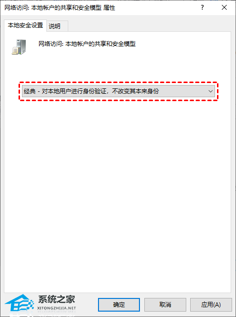 若以上步骤还是无法解决“你的凭据不工作”这一问题,您还可以在“安全选项”中找到“网络访问:本地账户的共享和安全模型”并双击打开它,然后将其设置为“经典 - 对本地用户进行身份验证,不改变其本来身份”并单击“确定”。
