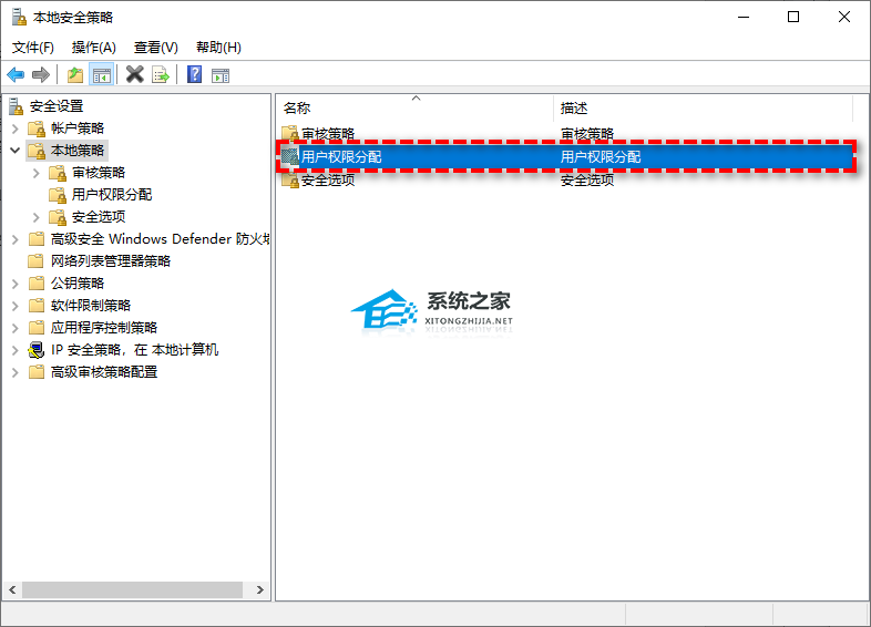 步骤2. 在本地安全策略中展开“本地策略”,然后双击“用户权限分配”选项。