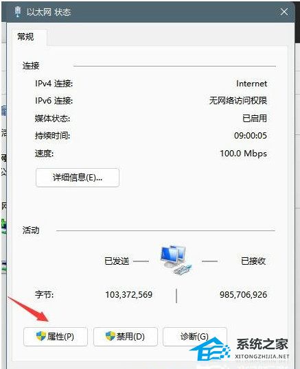 3. 路径是控制面板-网络和Internet-网络和共享中心,点击连接的网络,打开属性。