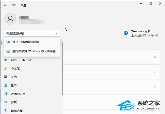 1. 设置窗口,使用搜索框,进入网络疑难解答。