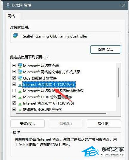 4. 在以太网属性窗口,双击打开Internet协议版本4(TCP/IPv4)。