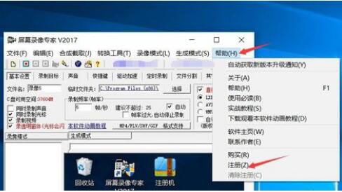3、之后打开我们已经安装好的屏幕录像专家软件,进入主页后点击“帮助”功能栏,点击【注册】功能;