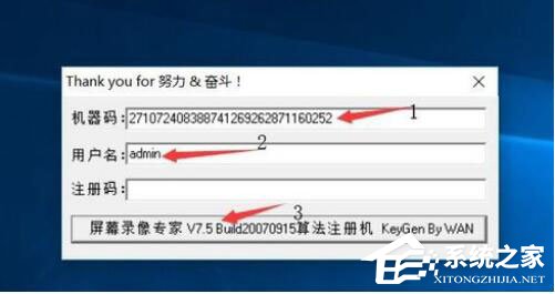 1、安装完成后,打开屏幕录像专家软件和注册机,将机器码复制到注册机上,并输入一个用户名(安装好屏幕录像大师后会收一个机器码);