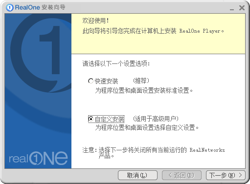 1、在系统之家将RealONE Player下载下来,并解压到当前文件夹中,点击其中的.exeRealOneGOLDcn(1).exe应用程序,进入安装向导界面,勾选自定义安装,点击下一步。