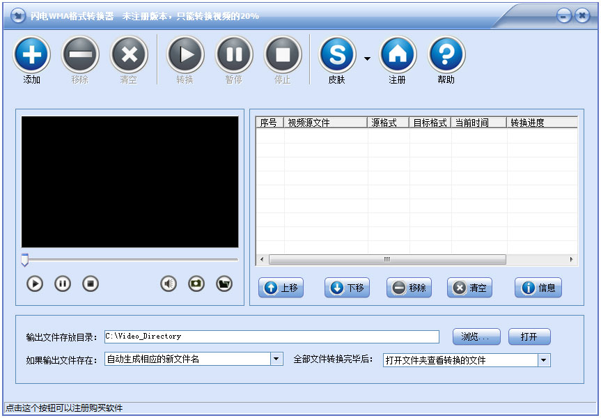 软件中预制了多种WMA格式转换方案(如标准WMA格式、高清WMA格式、优化WMA格式、高压缩WMA格式等等),可以满足您的不同的转换需求。软件还支持从任何视频格式中提取WMA音乐格式,比如将MP4转WMA、转WMA、MPG转换为WMA、FLV转换为WMA、RMVB和RM转换为WMA、WMV转WMA等等都可以实现。软件独有的支持DVD、VCD、SVCD、DAT等光盘视频转换WMA音频格式。软件支持各种MP3转WMA、转WMA,转换后的音质完美,不失真。软件支持批量转换、尤其适合有大量音频需要转换的用户。支持各种视频音频文件的播放预览、支持更换软件皮肤,操作极为简单,支持自动关机。