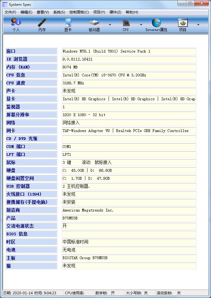 3、它的显示项目包括机主信息,内存,显卡,硬盘,CPU,驱动,安装软件等等。