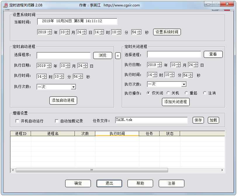 定时进程关闭器是一款简单的定时关闭电脑程序的软件,可以定时打开进程、执行文件,定时关闭进程,定时关机,系统启动时运行自动加载任务,保存任务,加载任务,调整系统时间,显示系统的所有进程等。
