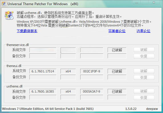 UltraUX Theme Patcher是款功能强大的的Windows主题破解限制工具软件,提供了良好的服务,如果您决定使用它,它不会造成任何问题,只需单击一下,即可为您展现一个新的世界,在这用户可以用这款软件解除各种限制,换上自己个性的主题!