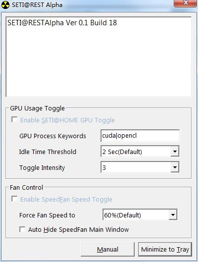 SETI@REST Alpha是一款上手非常容易操作的且能够自由调节显卡使用率的软件,能够对用户的显卡使用率进行调节,很多用户在使用电脑计算SETI的时候都非常的卡,通常都是显卡运行过载导致的,通过软件能够设置系统的显卡使用率,保证电脑不会卡。