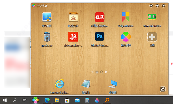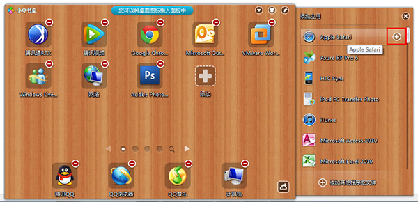 删除:将“小Q书桌”操作界面中已有的图标拖出到桌面上,表示不再受管理。