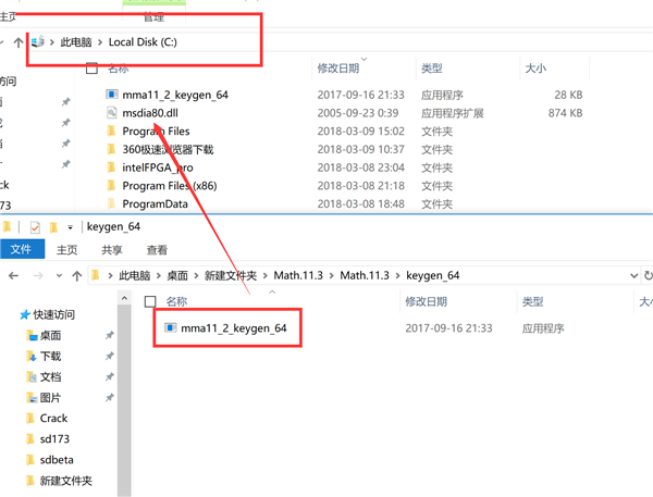 8、由于安装时间过长,我们先配置破解,小编是64位,所有将keygen_64文件内的mma11_2_keygen_64.exe移动到c盘根目录,其他位置也行,但不要由中文路径。