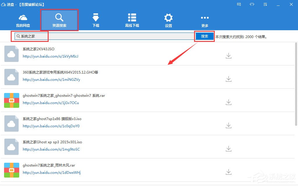 3、资源搜索的界面,输入需要进行搜索的关键字,点击搜索的图标,即可完成对文件的搜索下载;