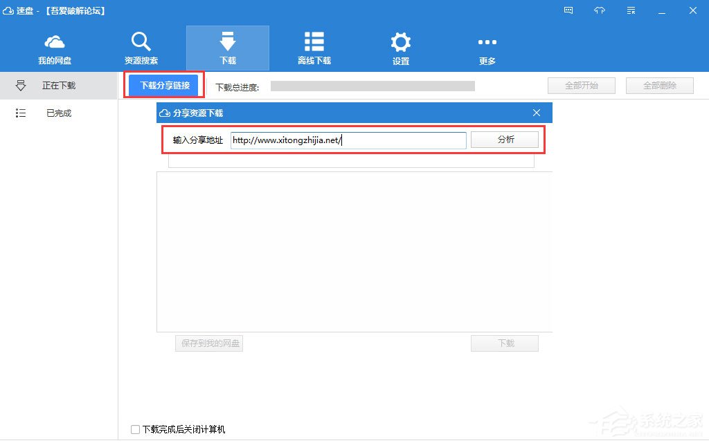 5、对分享链接的地址进行输入,点击分析即可对地址进行快速的解析;